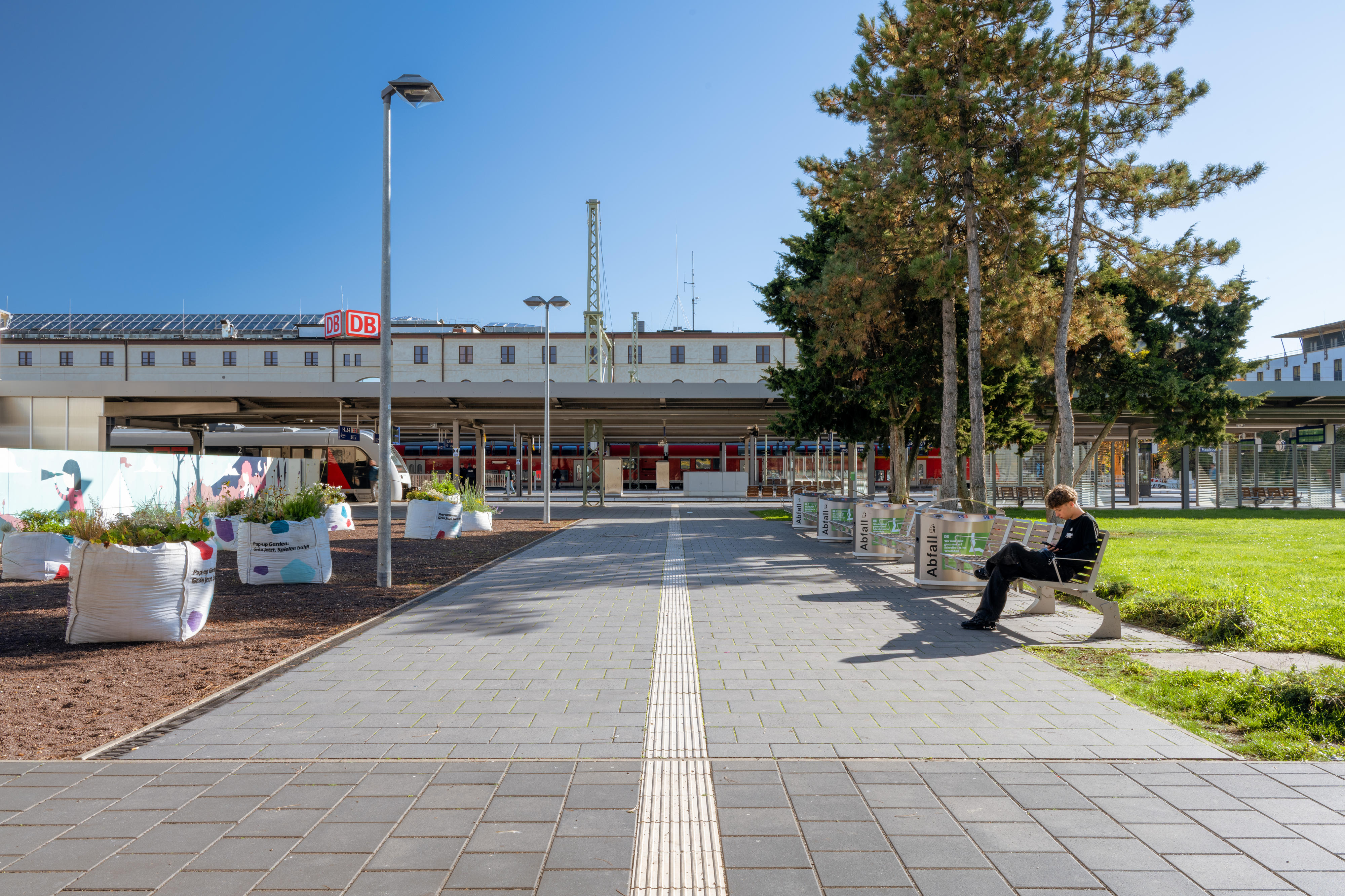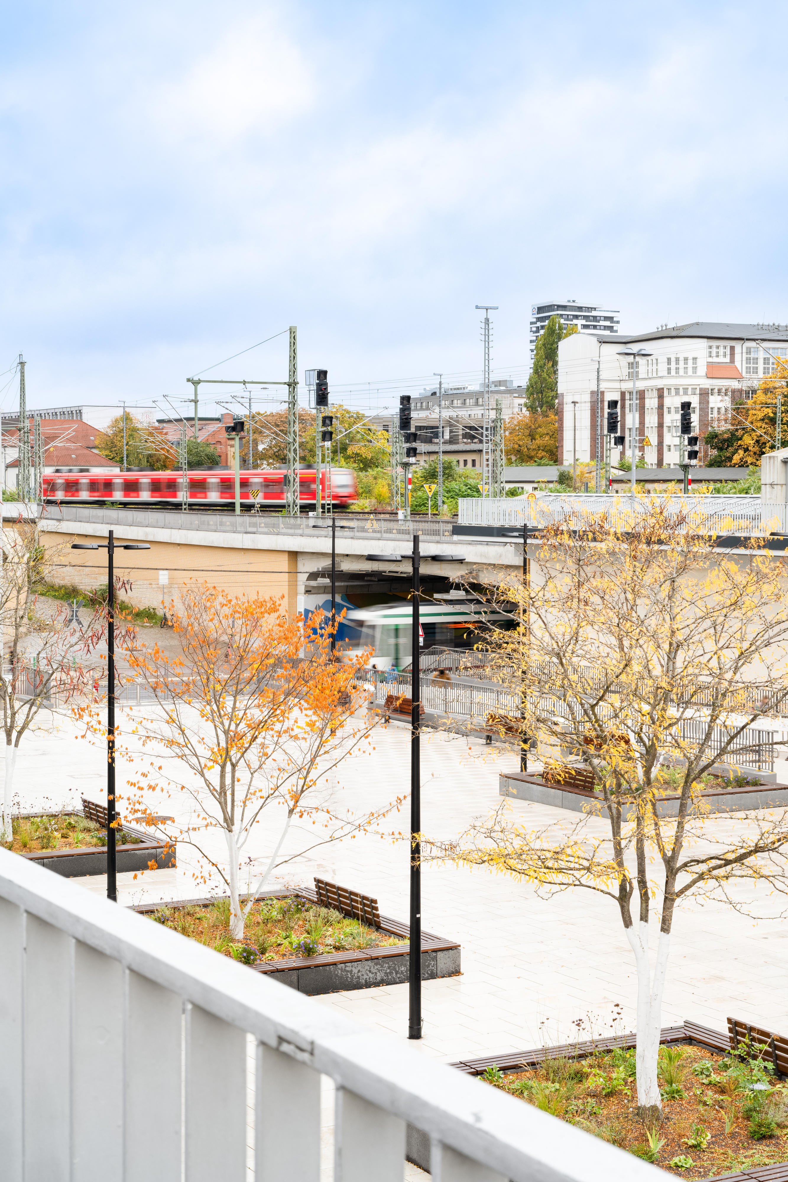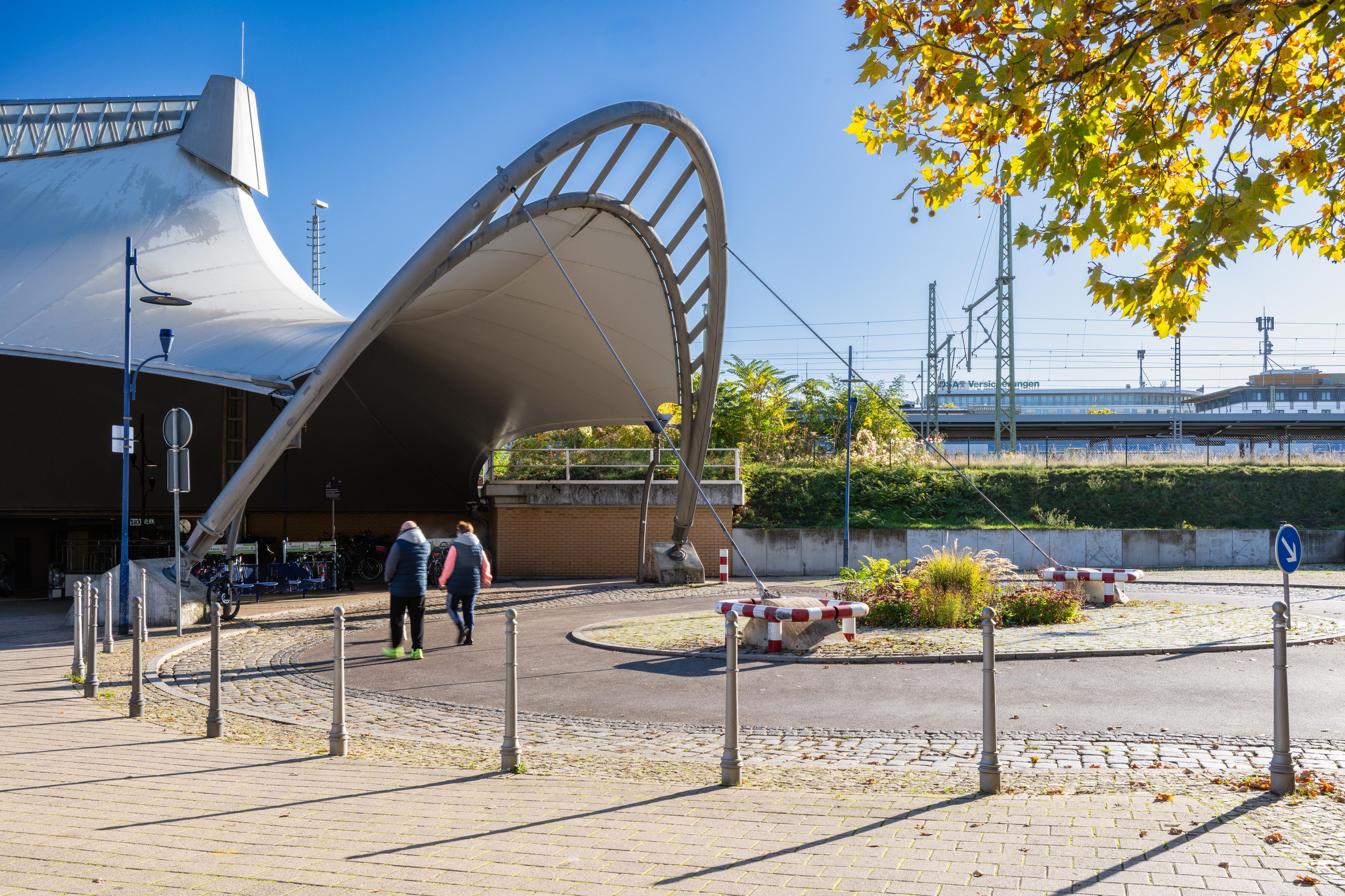 Auf der Westseite des Bahnhofs entstand der Eingang Konrad-Adenauer-Platz mit einem imposanten Zeltdach, das nicht nur den Weg zum Bahnhof weist, sondern auch als Wetterschutz für die Fahrrad-Abstellanlage dient. Von hier aus erreichen Reisende den Busbahnhof, Parkplätze, Car-Sharing- und Mietrad-Stationen – alles, ohne größere Straßen überqueren zu müssen. Der Willy-Brandt-Platz ist Fußgängern, Straßenbahnen und Taxen vorbehalten, was die Zugangssituation entspannt und sicher macht.