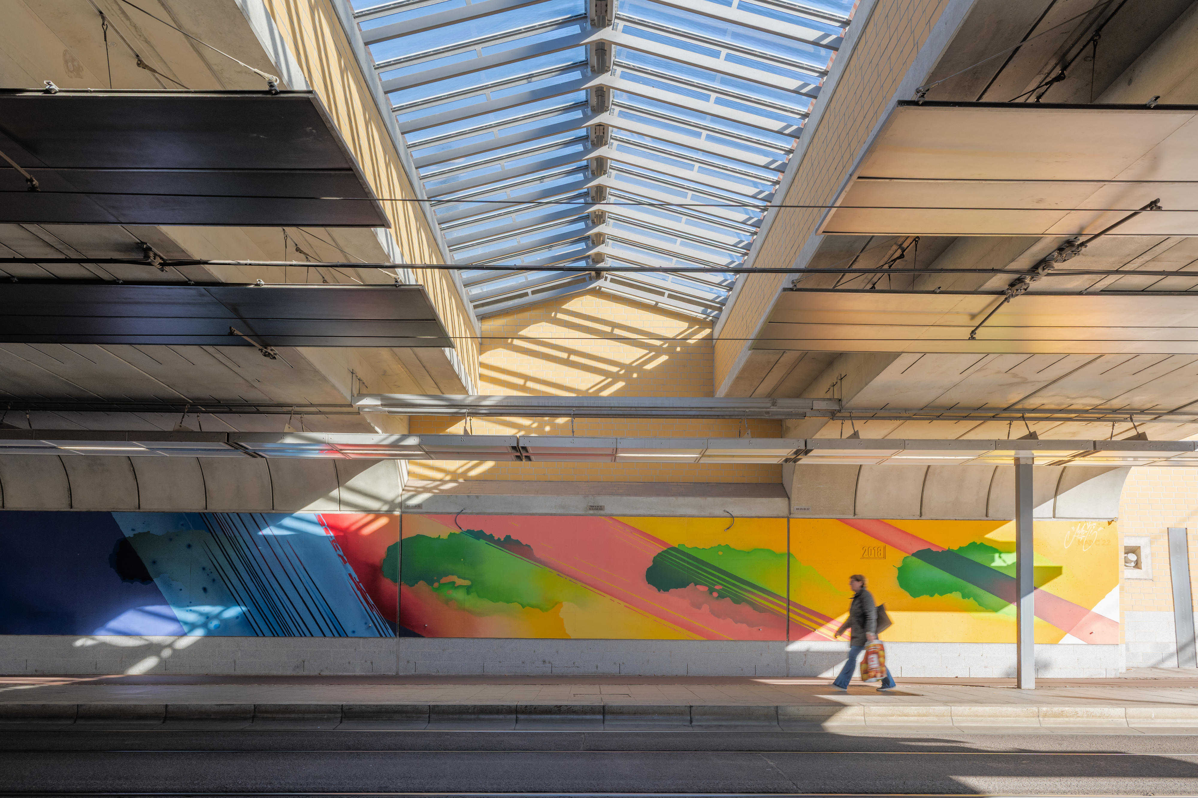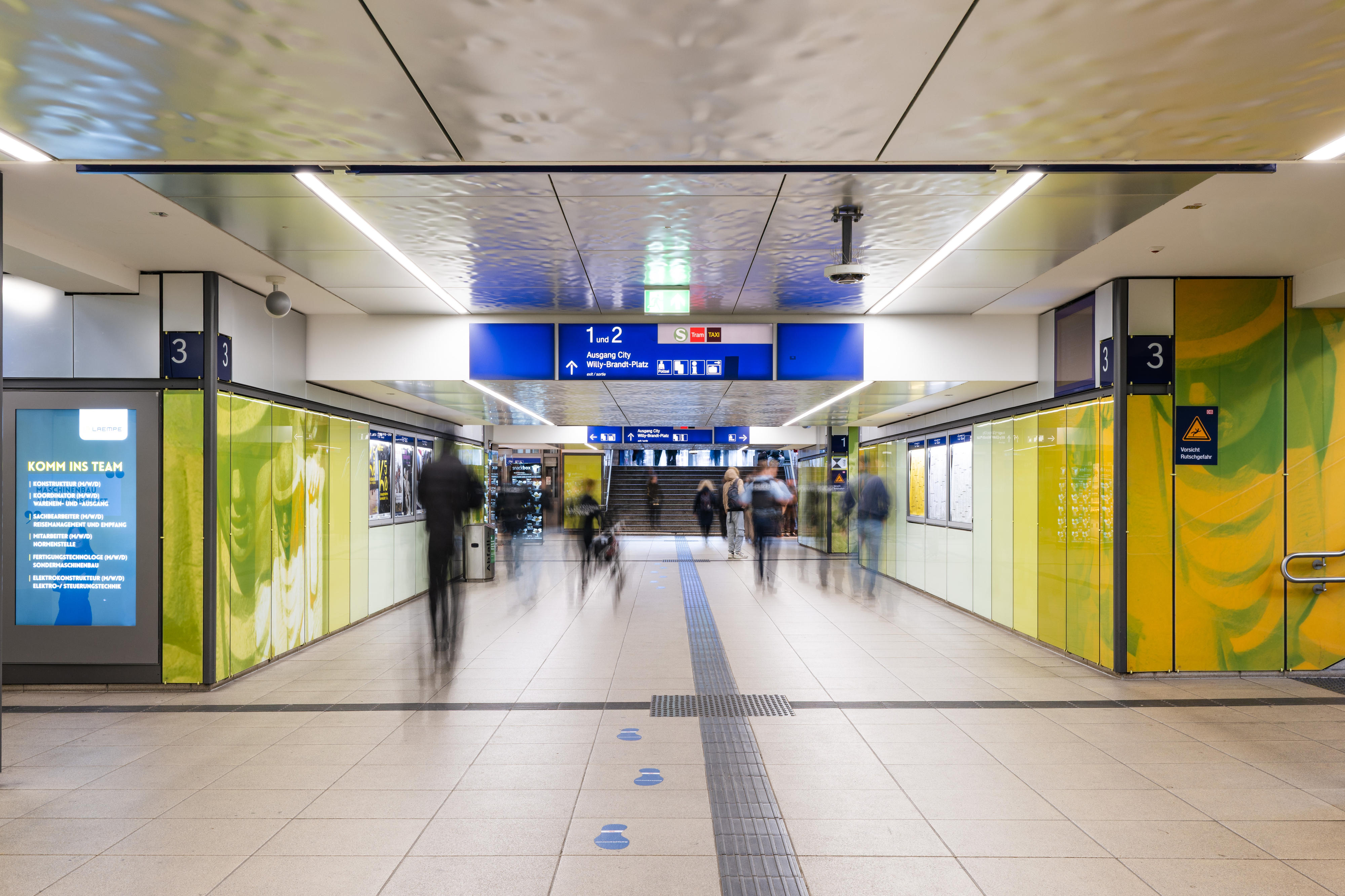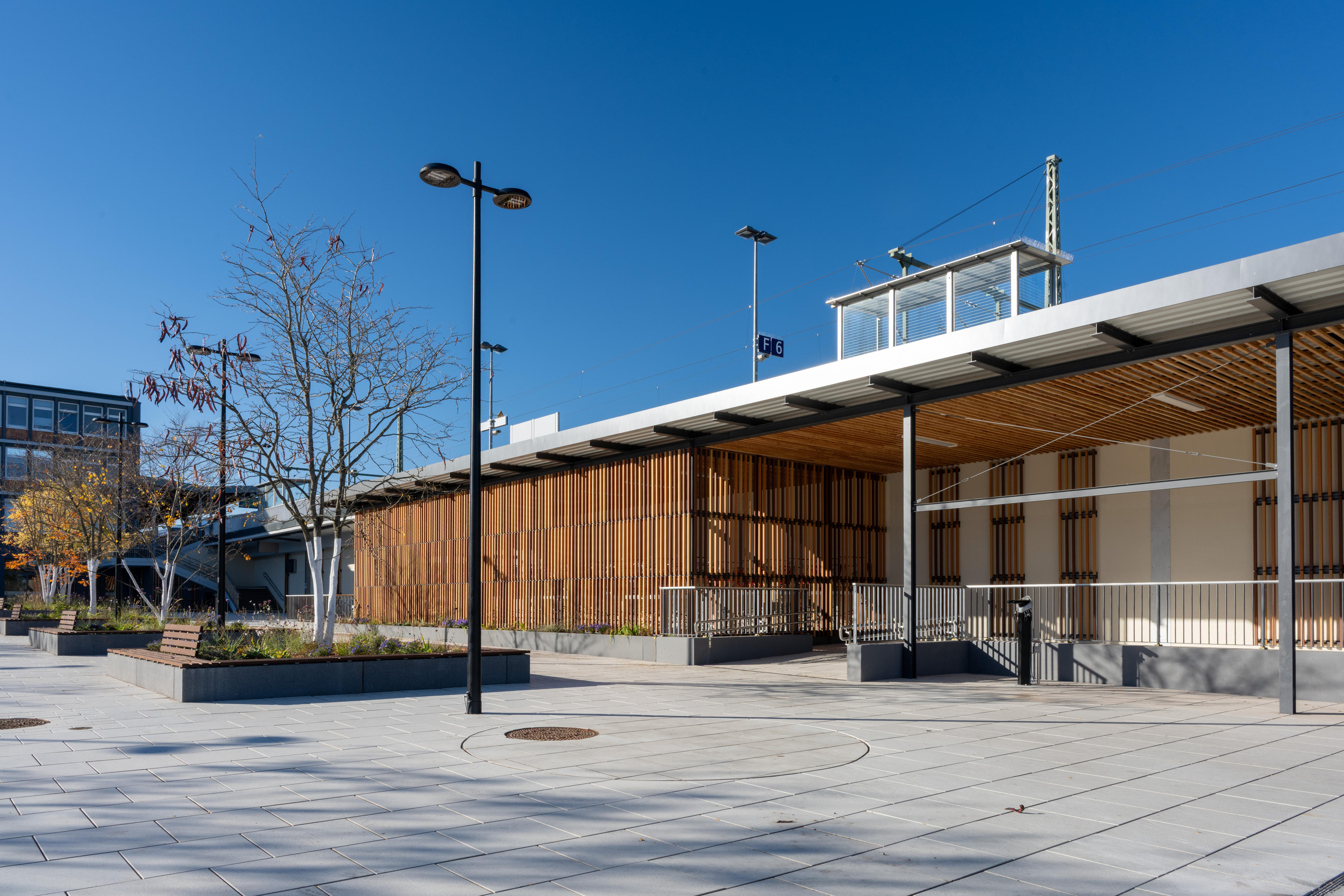 Auf der Westseite des Bahnhofs entstand der Eingang Konrad-Adenauer-Platz mit einem imposanten Zeltdach, das nicht nur den Weg zum Bahnhof weist, sondern auch als Wetterschutz für die Fahrrad-Abstellanlage dient. Von hier aus erreichen Reisende den Busbahnhof, Parkplätze, Car-Sharing- und Mietrad-Stationen – alles, ohne größere Straßen überqueren zu müssen. Der Willy-Brandt-Platz ist Fußgängern, Straßenbahnen und Taxen vorbehalten, was die Zugangssituation entspannt und sicher macht.