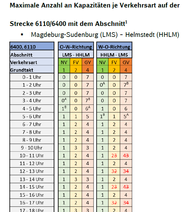 Folgende Anpassungen der Kapazitäten ergeben sich auf dem Abschnitt Magdeburg-Sudenburg (LMS) – Helmstedt (HHLM):