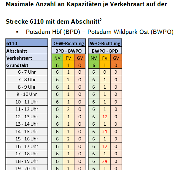 Folgende Anpassungen der Kapazitäten ergeben sich auf dem Abschnitt Potsdam Hbf (BPD) – Potsdam Wildpark Ost (BWPO):