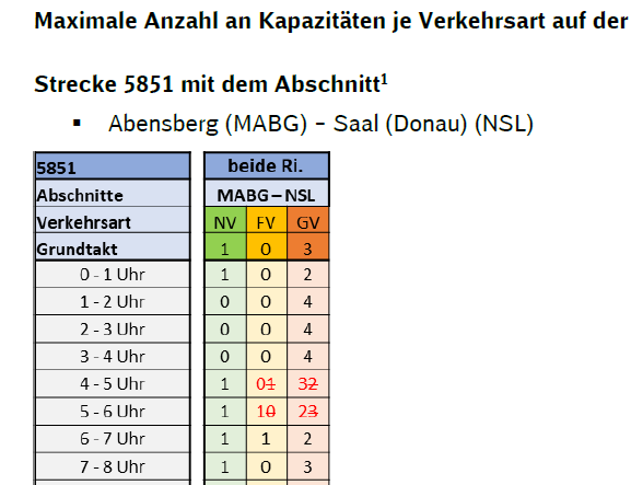 • TÜLS Generalsanierung Nürnberg – Regensburg und Obertraubling – Passau:Folgende Anpassungen der Kapazitäten ergeben sich auf dem Abschnitt Abensberg (MABG) – Saal (Donau):