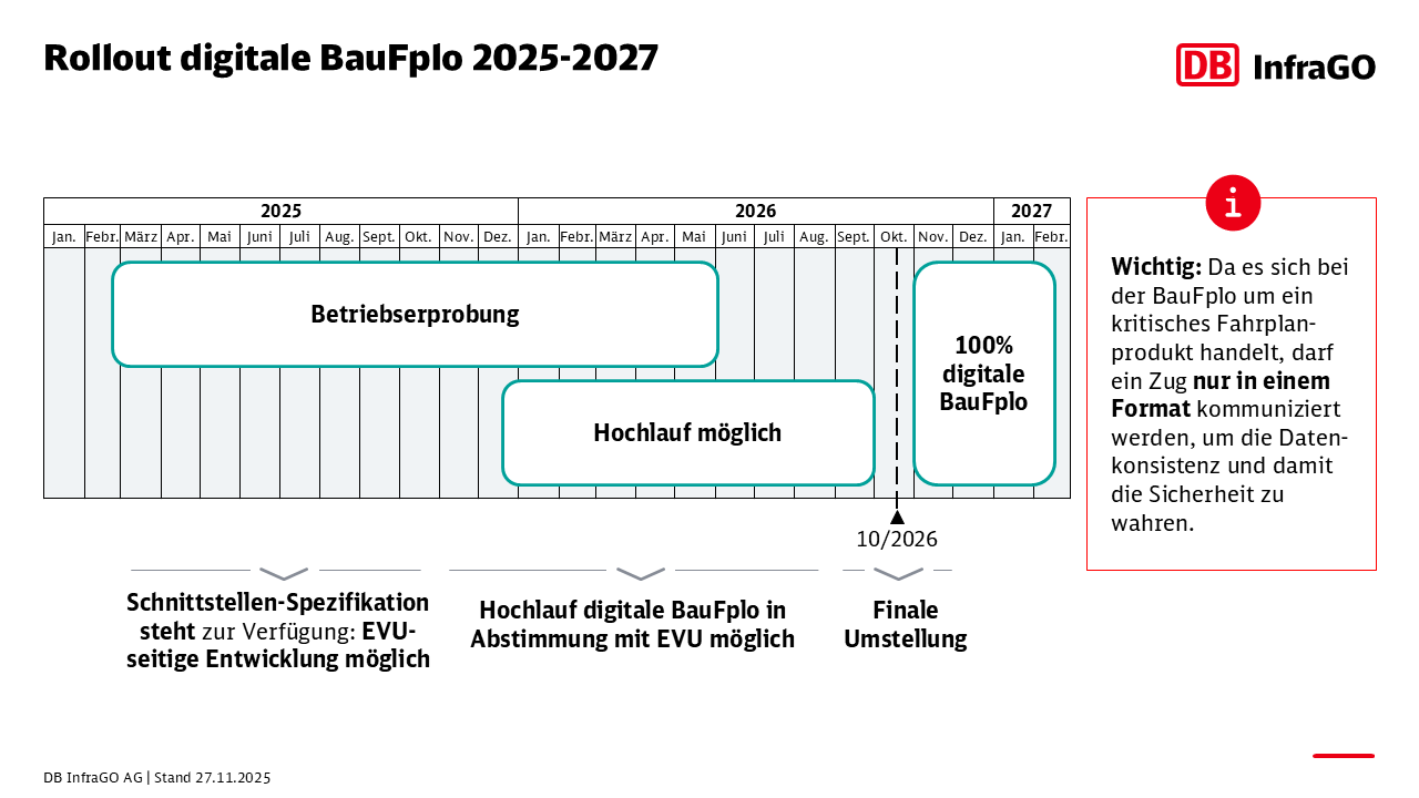 3. Hochlaufphase in 2026: Der Rollout der digitalen BauFplo beginnt im Dezember 2025. Ab diesem Zeitpunkt werden das alte und das neue IT-System parallel betrieben. Im Laufe des Jahres 2026 steigt die Anzahl der versendeten digitalen BauFplo-Dokumente im Regelbetrieb kontinuierlich, in gemeinsamer Absprache zwischen EVU und DB InfraGO an. Um die Konsistenz der Daten sicherzustellen, wird während der Hochlaufphase ein Zug nur in einem Format, entweder alt oder neu, kommuniziert.